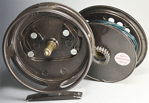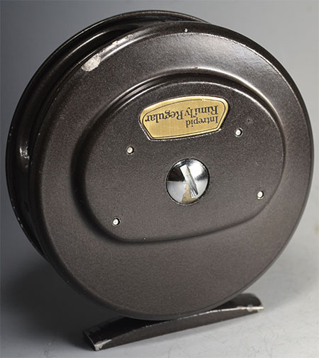 英国のイントレピッドのリールには、特徴あるハイ・スピードタイプの”ギヤー”と通常のレギュラー・モデルがあります。このりーつはイントレピットのレギュラー・タイプのモデルです。未だタフな作りの英国製アンテイーク・リールの趣をどことなく感じさせる重厚な作りのフライ・リールです。 状態はかなり良好で使用頻度がかなり少ないように見えます(外観からの当店の推測では多くてもほんの10〜20回回程度ではないかと思われます)。クリック音もしっかりとしていてトングの磨耗などは感じられませんのでこれからも長くご使用になれるでしょう。 アウト・スプール・タイプのリールの外径(スプールの)は約97.6mm、スプールの内幅は約17.6mmです。適合ラインは#5〜6程度でWFの場合は#7程度まで御使用になれます。リール・フットのサイズは約12.7mmx56.7mm、もだーんなロッドのリール・シートにも固定できる一般的なサイズです。 リールに巻かれた3M製と思われる”マスター・ライン”WF7Sとスプール裏面に貼られたシールに表示されているシンキング・ラインの状態も大変良好で、使用頻度はかなり少ないように見えます。尚ラインの使用頻度が少ない事と状態が極めて良好な事は一見して分かりますが、サイズや仕様は添付されたシール等からの当店の推測です。 リール・本体の裏側には、イントレピッドのロゴ・シールが綺麗な状態で残されています。今後も長くご使用いただける貴重なアンテイーク・モデルです。リールは右巻きに設定されていますが、左巻きにも簡単に変更する事ができます。当店お問い合わせ番号SB610。アンテイーク・リールとしては状態はかなり良好、 グレードは