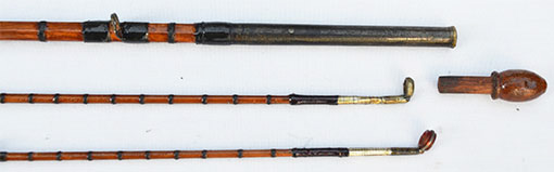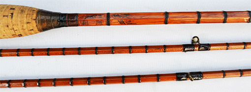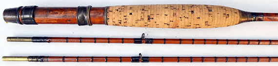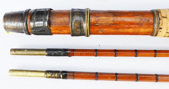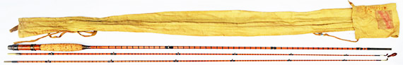 薄くカットされたコルクで作られた大変珍しい手の込んだ凝った作りのコルク・グリップの全長は約15cm、最大外径26mm。グリップ上部のブランク対面外径約9.6ミリ、トップ・ガイド下の対面外径2ミリ。前のオーナーが全体の防水上塗りを行なっており、これからも長くご使用になれる状態になっています。1個のメノウ・トップ・ガイドが交換されて両方のトップのメタリック・ワイヤーが巻きなおされた可能性がありますがそれ以外格別のレストアーは行われいないオリジナルを保ったアンテイークと思われます。 アンテイーク愛好家の方にとっては大変貴重で珍しいショート・ナチュラル・バンブーのファーローです。2ピース、2テイプ、オリジナル布ケース付き、フェルール・キャップ1個が揃って付いています。 外観からは一人のオーナーにより丁寧に使用されている上に、かなりオリジナルの状態を保ったアンテイーク・ロッドです。ロッド各部に目立つような欠落やショートなどが見られないかなり良好なグレード