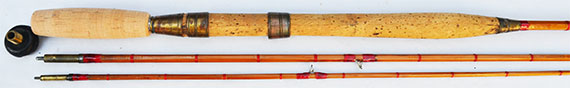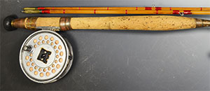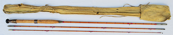 アクションは伝統的な英国のロッドとは若干異なり、日本のフライ・フィッシャマンの方にはお馴染みのかなりデリケートなロッドです。渓流のヤマメをメインに中流域のトラウトまで、ドライからウエットまでと、幅広くご使用になれる多目的シングル・ハンド・ロッドです。ラインは#4〜5をメインに#3〜#6程度も使用可能です。 ロッド重量約210グラム、一体式柾目コルクのバット・エンドまでの全長31cm、グリップの最大外径は約23mm。グリップ先端部のブランクの対面外径約9.4mm、トップ・ガイド下は約2.3mmです。ほぼロッドの基本的部分はオリジナルの状態を保ったアンテイークとしては良好な状態です。