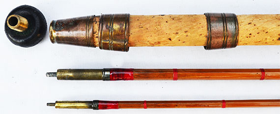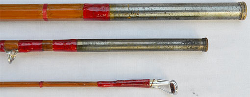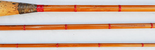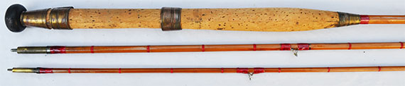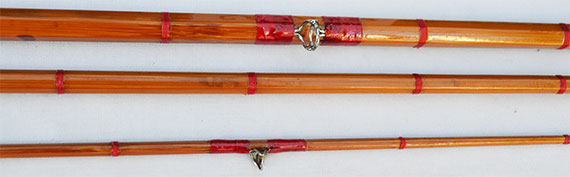 通常はシングル・ハンドでご使用いただき、グリップ・下端部には一握り程のスペースがあるのでセミだ・羽鶴でのご使用も可能です。当店オリジナルのイングリッシュ・エクステンションの取り付けも可能です。 英国に於いて少なくてもラッピング部とロッド全体の上塗りが行われたと推測しています、全てのスレッドも巻き直されている可能性が高いと考えられます。そのお陰でロッドの状態はアンテイークしてはかなり良好な外観です。今後も長くご愛用いただけるアンテイーク・ロッドです。 オリジナル布ケース付、3ピース、1テイップ。当店お問い合わせ番号SA1064。グレードは