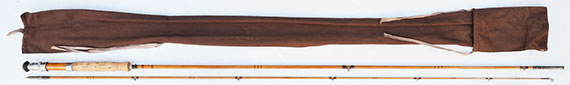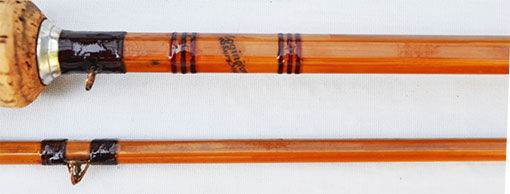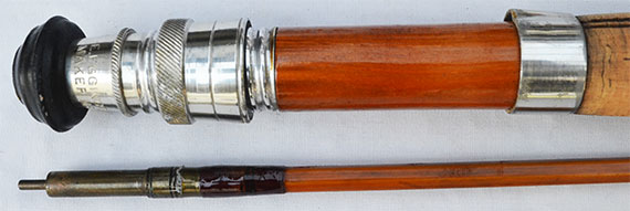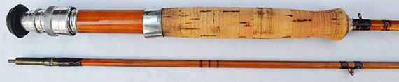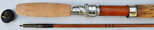 ブラス・シートやフェルール、ガイドなどから1950年代と推定しましたが、パーツ類の凝った作りなどからかなりデラックスなモデルと思われます。ロッドの状態がかなり綺麗な事が一見して直ぐ目に付く特徴です。現代のフライ・ロッドに近いデリケートなアクションはどなたでも馴染みやすいアンテイークと言えます。 ロッド重量は約160グラム、ワインデイング・チェック上部のバット・セクションの対面外径は約8.4mm、トップ・ガイド下の対面外径は約2.5mmです。英国のアンテイーク・ロッドとしてはかなりデリケートなアクションなので、#4〜5ラインをメインに#6程度まで対応できる渓流・中流域の万能タイプのモデルです。