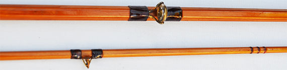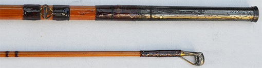 ストリッピング・ガイドはリング金具の外径約9.31mmの綺麗な状態のクリヤー・メノウが取り付けらえれています。ロッドには目立つほどの傷などが見れれません。他のガイドは凝った作りのブロンズ・カラーのオープン・フレームが取り付けられています。これらのガイドには錆などが見られません。これらからもこのモデルはかなりデラックスなモデルとして作られたことが推測できます。 |