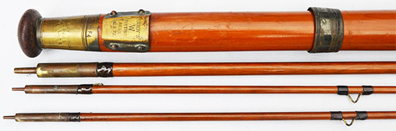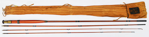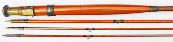 ロッド重量約260g、ブラス・ワインデイング・チェックまで含めた凝った作りのシート一体式ウッド・グリップの全長は約35cm、グリップの最大外径約24.5mm。ワインデイング・チェック上端のバット外径約11.5mm、トップ・ガイド・ラッピング部下のテイップの外径1.6mm。汎用性の高い事が特徴のアンテイーク・ロッドなので適合ラインは#4〜5をメインに#3〜6程度まで使用することができます。 アンテイーク・ロッドに慣れた方ならセミ・ダブルは勿論シングルでのご使用もお楽しみいただけるでしょう。 ロッド全体の状態は約120年程前のアンテイークとしては使用感もそれほど多くない様でかなり良好ですが、2本のテイップの内1本の先端部が約7cm程ショートしています。トップ・ガイドも少し傷んでいたので交換し、加えて一番上のスネーク・ガイドの位置を約2cm程下の位置にずらして巻直しと塗装を行いました。レストアーの終了後、2本のテイップを交換しながらコートランドのWF5ラインでそれぞれシングル・ハンドで20回、セミ・ダブルで30回連続して、合計100回、キャステイングのテストを行いました。両方のテイップとも問題なく快適なキャステイングを行う事が出来ました。 渓流・中流域から本流・中小湖水までご使用になれる万能タイプのアンテイーク・ロッドです。古い時代の凝ったハーデイのロゴが付いたオリジナル布ケースが付いていますが100年を経過しているためかなり傷んでいます。3ピース、2テイップ。当店お問い合わせ番号SA1066。3ピース、2テイップ。グレードは
