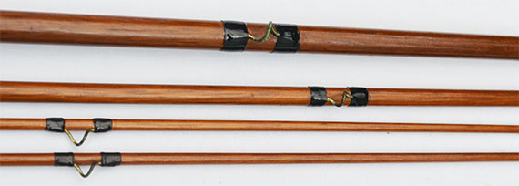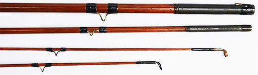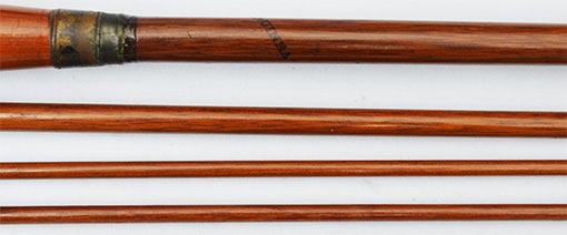 トップ・ガイドは他のガイド類と同一性を保った金属製のライト・ガイドが使用されています。フェルールの差し込み具合も良好でがたつきなどは見られません。グリーン・ハート・ロッド愛好者の方にお勧めの極めて貴重なアンテイーク・ロッドです。 前述のごとく画像下段の1本のテイップが約56mm程ショートしていたため、今後の長いご愛用を考慮して若干傷んでいたトップ・ガイドを現代風のブラックのトップ・ガイドと交換して一番目のスネークの位置を2cm程下にずらして再度巻直しと塗装を行いました。 2本のテイップは当店の連続100回のキャステイングでは問題なく行う事が出来ました。 |