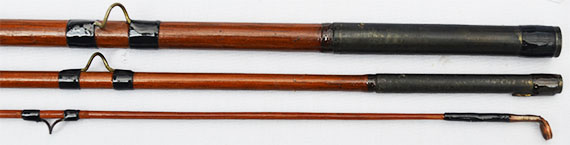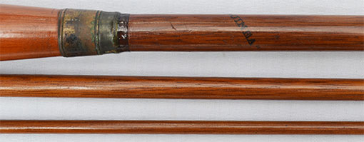 ロッド重量約174g、ブラス・ワインデイング・チェックまで含めたシート一体式柾目コルク・グリップの全長29.5cm、グリップの最大外径約24mm。ワインデイング・チェック上端のバット外径約10.4mm、トップ・ガイド・ラッピング部下のテイップ外径1.5mm。適合ラインは#3をメインに#2と#4程度まで使用することができます。 布ケースはオリジナルではないと思われます。3ピース、1テイップ。1900年代初頭の古い英国製品らしい重厚なアンテイークの雰囲気を保った外観の大変良好な状態です。当店お問い合わせ番号SA1066。3ピース、1テイップ。グレードは