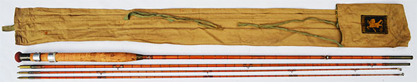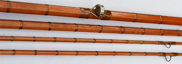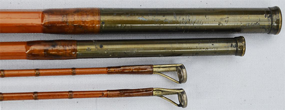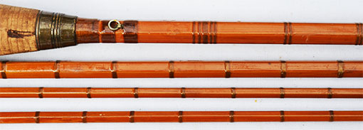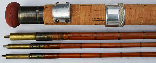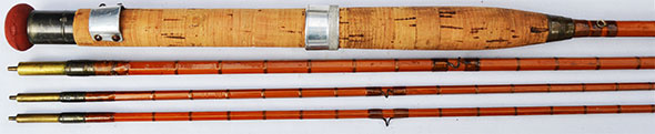 このロッドやケースなどから推測すると多くの1930年代のロッドらしい、当時の特別の人達の楽しみであったフライ・フィッシング用品らしい凝った造りの贅沢なロッドの雰囲気が感じられます。 100年以上の年月を経たロッドの状態としてはかなり良好で、タバコの煙を燻らせながらフライ道具を肩に掛けた当時のフライ・フィッシャマンのロゴ・マークが綺麗に残るロッド・ケースの状態などからも丁寧に使用された様子が推測されます。2テイップがこのような良好な状態で揃っていることも貴重です。100年以上のロッドが使用可能なこのような良好な状態で残されていることに驚かされます。 現代のロッドに近いデリケートなアクションは多くの方に馴染みやすいモデルで、どなたにも違和感なくロッドに馴染めると思われます。適合ラインは#5〜6、渓流の中流域や本流、中小の止水域ででのキャステイングを存分にお楽しみいただけるロッドです。アンテイーク・ロッドに慣れた方ならシングル・ハンドをメインに状況に応じてライト・スペイにも対応できます。シートのリテイナーとラバー・エンドの間には一握り程の、約4cm、スペースが有ります。 ロッド重量約210グラム、グリップ上部の対面外径は約9mm、トップ・ガイド下の対面外径は約2.4mm。ロッドの仕舞い込み寸法は約1mです。シートと一体になったコルク・グリップのラバー・エンド下端からワインデイング・チェック上端までの長さは約32cm、最大外径は約25mmです。ロッドの仕舞い込む寸法は約100cmです。 ロッドの状態は一般的なアンテイーク・ロッドの形状ですが、100年を経た年代感を感じさせない綺麗な外観から、英国のオーナーがかなり丁寧に使用したと推測されます。100年前の英国の同じ仲間の思いが感じられるロッドです(どのアンテイークとも同じく)。100年以上経たロッドとしては珍しいことにエクストラ・テイップが付いていますので今後も長くご愛用頂ける状態です。 大変貴重な2テイップ・3ピース・モデル、綺麗な状態のロゴ・マーク付きのオリジナル・ロッド・ケースが付いています。当店お問い合わせ番号SA1075。 グレードは