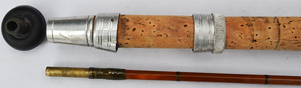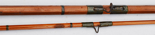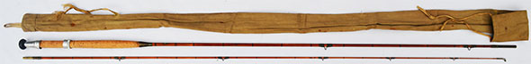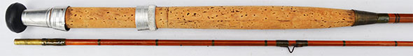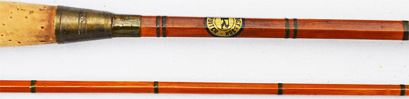 年代等は当店で扱った他のラッジのロッドとの比較からの推定ですが、ガイドが全てスネークであることやグリップが柾目コルクを使用していることなどが推定の大きな根拠です。1950年代より古い時代(はたして操業していたかは不明ですが)も考えられるアンテイークの雰囲気が高いロッドです。適合ラインは#4〜5と思われますが#3も問題なく適応できる繊細なアクションのモデルです。アンテイークの雰囲気を楽しめる外観ですが、現代のアクションに慣れた方でも格別意識せずにスムースにお使いできるロッドです。 一般的な渓流から中流域まで、フライもドライからニンフまでと多目的にご使用になれるロッドです。ロッドの状態は、かなり古い時代のモデルのアンテイークとしてはかなり良好で大きな曲がりや破損・傷などは見られません。ロゴ・マークなども綺麗な状態で残っています。 ロッド重量約170グラム、仕舞い込み寸法は約133cm。古い時代のロッドの特徴である柾目コルクが使われたシート一体式のグリップの全長(ラバー・エンド下端からブラス・ワインデイング・チェック迄)約33センチ。グリップ上端部のロッドの対面外径約9mm、トップ・ガイド下の対面外径約2.3mm、2ピース。アンテイーク・ロッドとしては通常の状態です、ロッドとしての機能は良好と言えます。メーカー・オリジナル・ロッド・ケース付。 当店お問い合わせ番号SA1078。グレードは