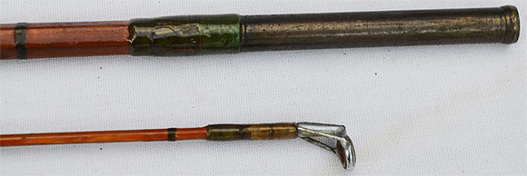 画像上のストリッピング・ガイドもスネークが使用されています。当店で1950年代以前の古いアンテイークの可能性も推測している根拠の一つです(確証はありませんが)。 英国ではかなり丁寧な使用がなされたことが推測出来る事から、ラッピング各部の巻き直しや断裂などは見られないきれいな状態です。ブランクにも大きな傷や塗装面の剥離などは見られません。これからも長くご使用になれるでしょう。 画像下のテイップのガイド下に小さな茶色の部分が見られますが表面塗装の剥離を塗った個所と思われます。今後の御使用には格別の支障はありません。 |