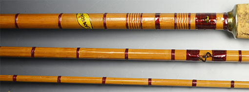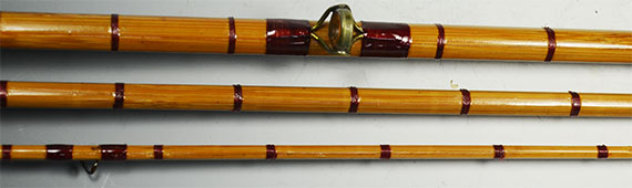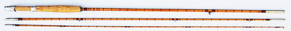 現代のロッドに近いデリケートなアクションは多くの方に馴染みやすいモデルです。適合ラインは#5〜6をメインに#4程度もご使用になれるので、渓流から中流域や中小湖水でのキャステイングをお楽しみいただけるロッドです。 ロッド重量約190グラム、グリップ上部の対面外径は約9.9mm、トップ・ガイド下の対面外径は約2.27mm。シートと一体になったコルク・グリップ部の長さは約16cm、最大外径は約26mmです。リング・シートがセットされた下部コルク部のキャプ下端部までの長さは約12cmです。 ロッドの状態は一般的なアンテイーク・ロッドの形状ですが英国のオーナーが全てのラッピングを巻き直した可能性が感じられますので今後の長いご使用に問題はないと思います。当店でインター・ミデイエット部分を除いたすべてのガイド・ラッピング部の防水上塗りを行い、併せてテイップの軽微な曲がり直しを行いました。 3ピース・1テイップ・モデル。当店お問い合わせ番号SA1061。 グレードは